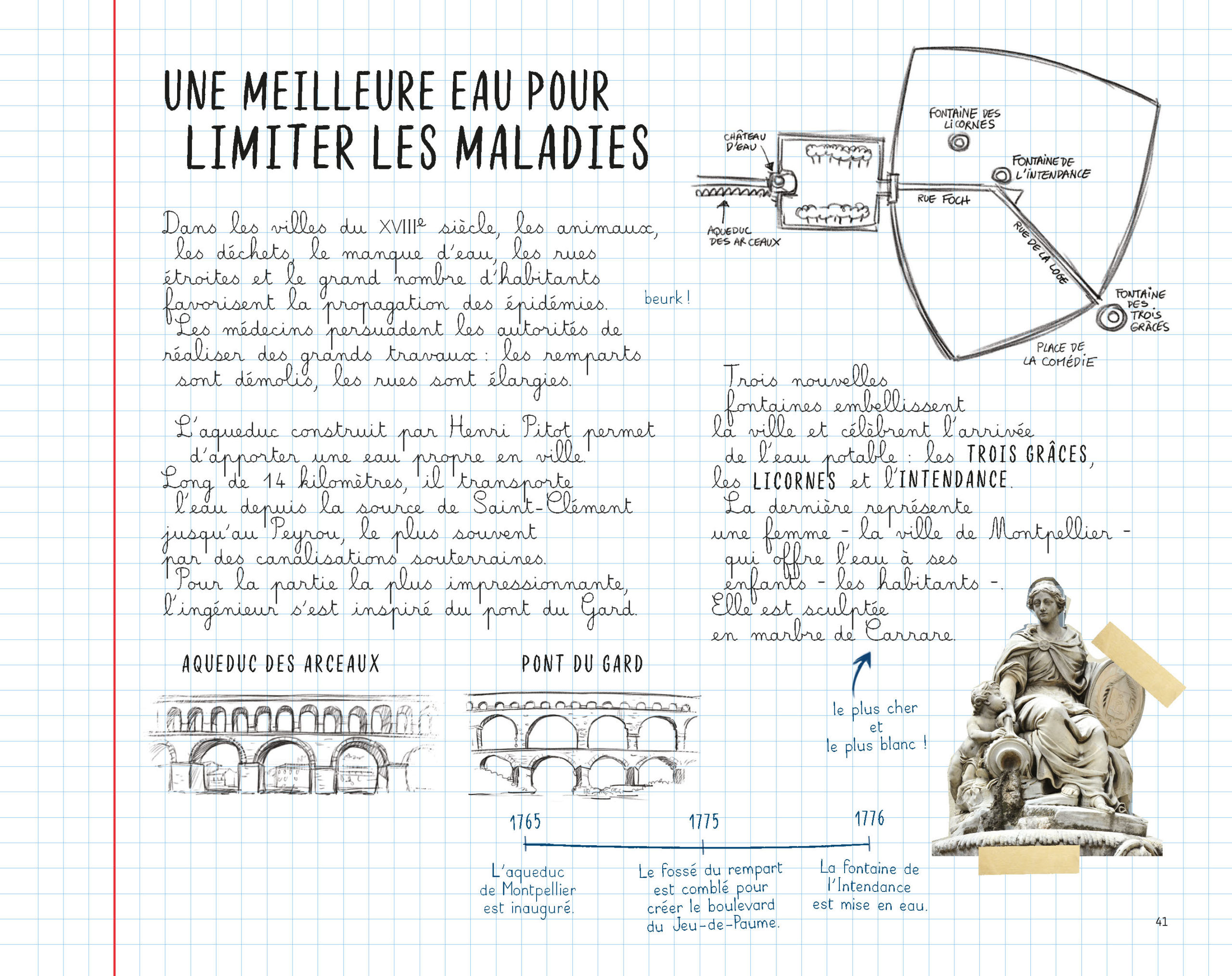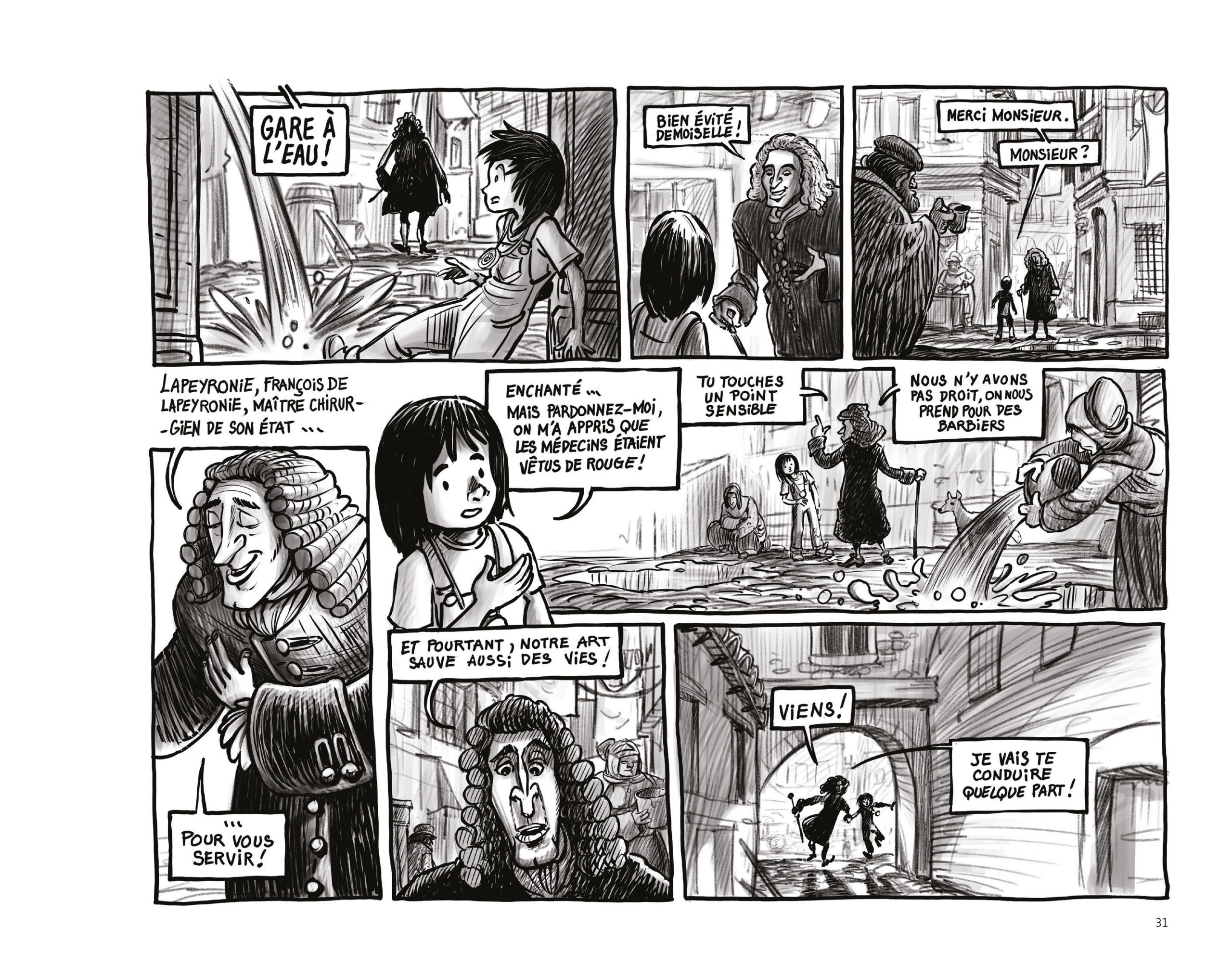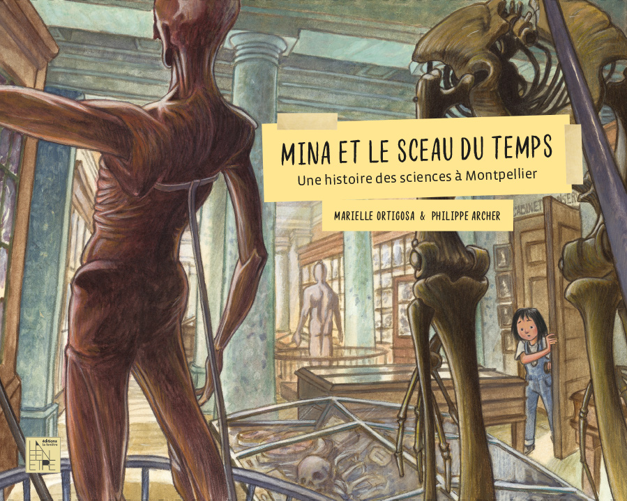 Rédigé par Marielle Ortigosa et magnifiquement illustré par Philippe Archer, Mina et le sceau du temps, convoque lieux et personnages emblématiques de l’histoire des sciences à Montpellier. Depuis Arnaud de Villeneuve qui accueille Mina dans la salle des doléances du palais des rois d’Aragon, à l’astrologue Michel de Nostredame ou au médecin François Rabelais. Sans oublier Pierre Richer de Belleval croisé au Jardin des plantes, François de Lapeyronie qui veut lui faire assister à une dissection, ou encore l’architecte Henri Pitot qui s’apprête à inaugurer l’aqueduc Saint Clément.