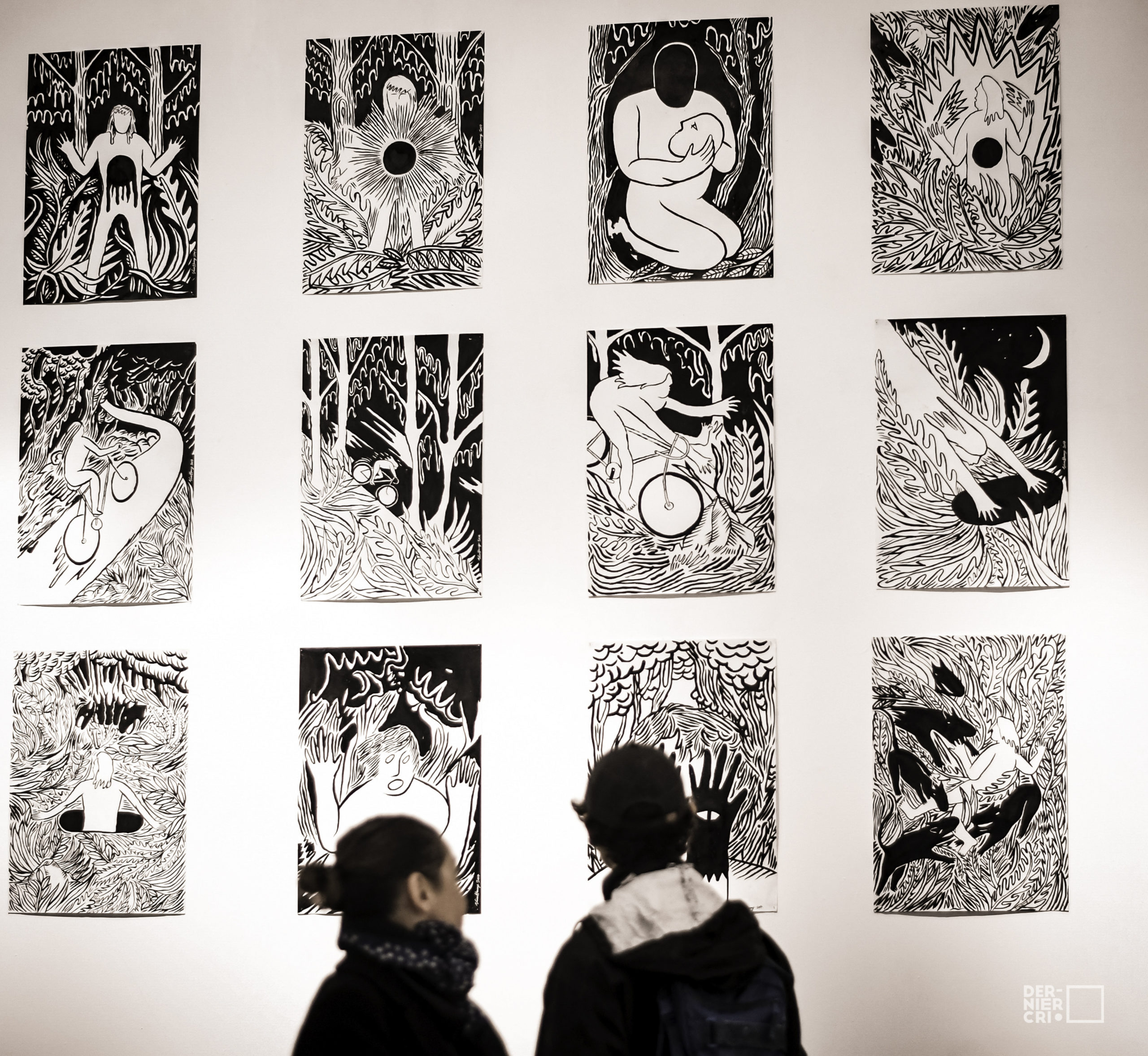 La deuxième partie de l’exposition est constituée de dessins originaux au stylo à billes ou à l’encre, pour des commanditaires tel que Rock en Seine ou pour des magazines internationaux comme Club Milano magazine, mais aussi une sélection de dessins personnels de l’artiste ainsi qu’une série d’illustrations inédites réalisées pour cette exposition.